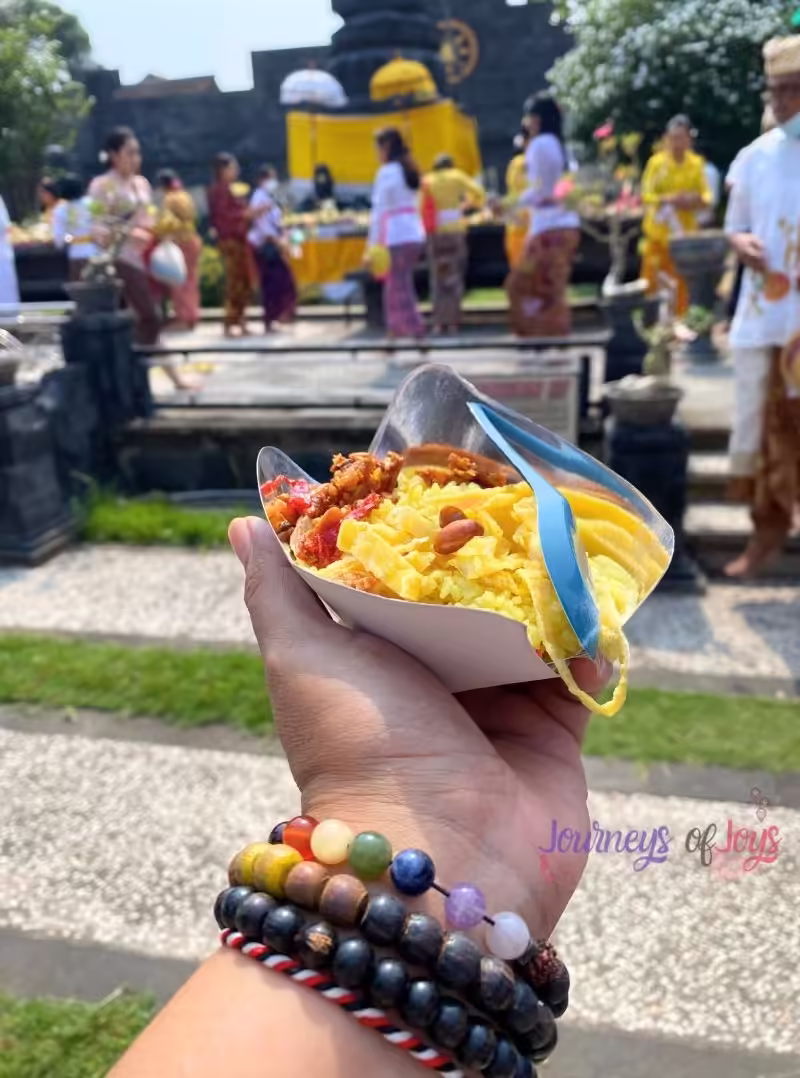 A significant aspect of Hari Kuningan is the preparation of yellow rice (nasi kuning), a symbol of prosperity. This special dish, along with other offerings, is a gesture of gratitude to Hyang Widhi (God Almighty) for the blessings of life. At Pura Jagatnatha Banguntapan in Yogyakarta, after a communal prayer, the yellow rice and its side dishes are shared among devotees, fostering a sense of togetherness.